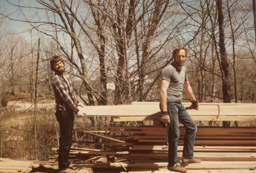 Stuart Emmons (left) and Sam Bush at Potter's Mill, Gilmore, NH, 1978