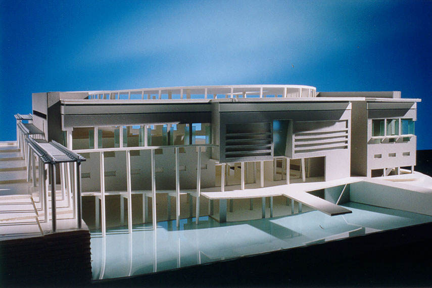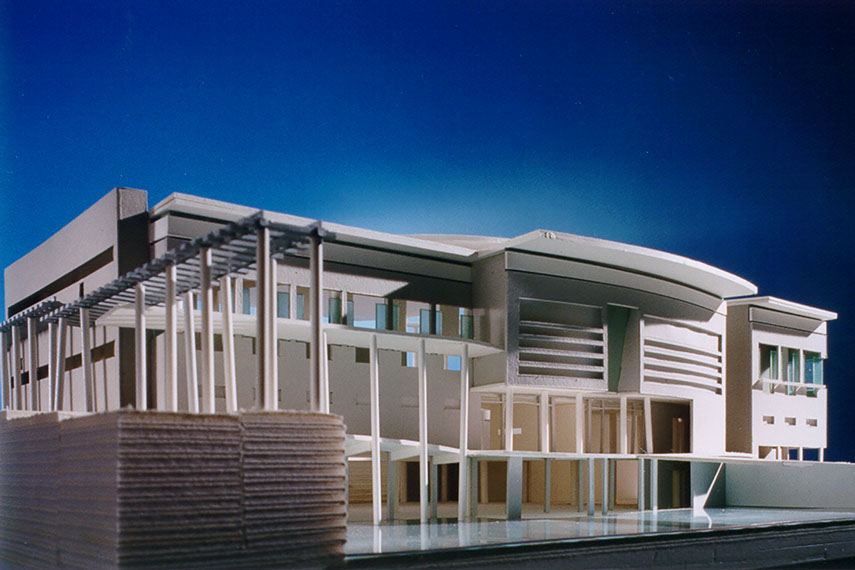 The front entry to the building was over a bridge spanning a reflecting pool. A colonnaded front porch that reflected the area’s close ties to Thomas Jefferson’s designs was at the entry. The front side’s fenestration and proportioning were modern interpretations of traditional Virginia libraries. Instead of shutters, there was more glass, but stepped and sized to reflect traditional wood shutters. The symmetry of the building was impacted by the program and site conditions, such as a ramp from the parking lot and a bicycle path coming through the building along a rail right-of-way.