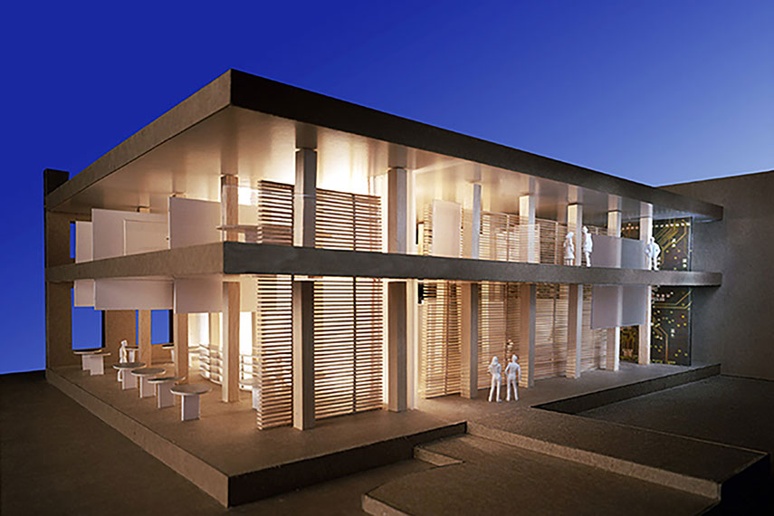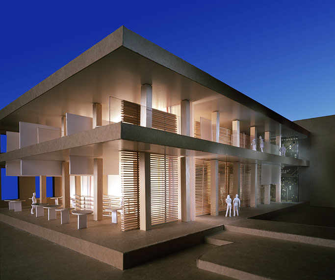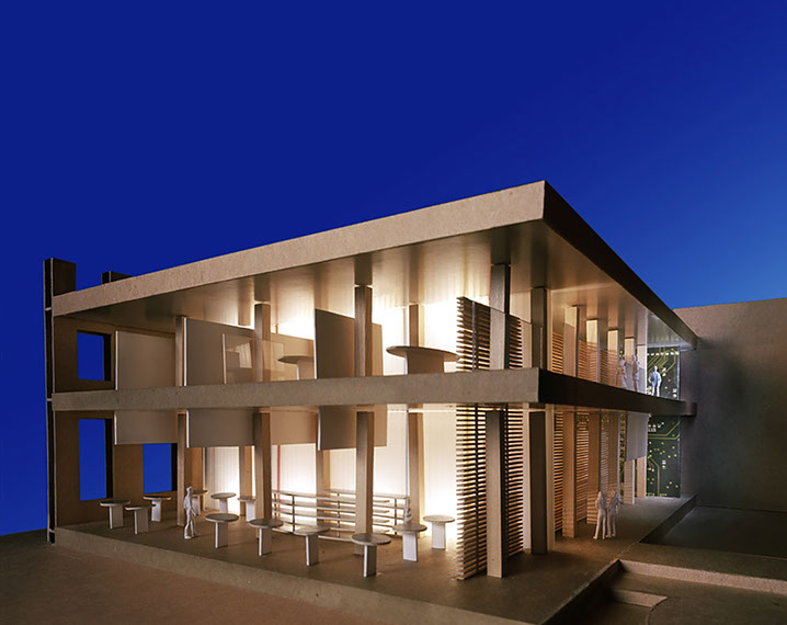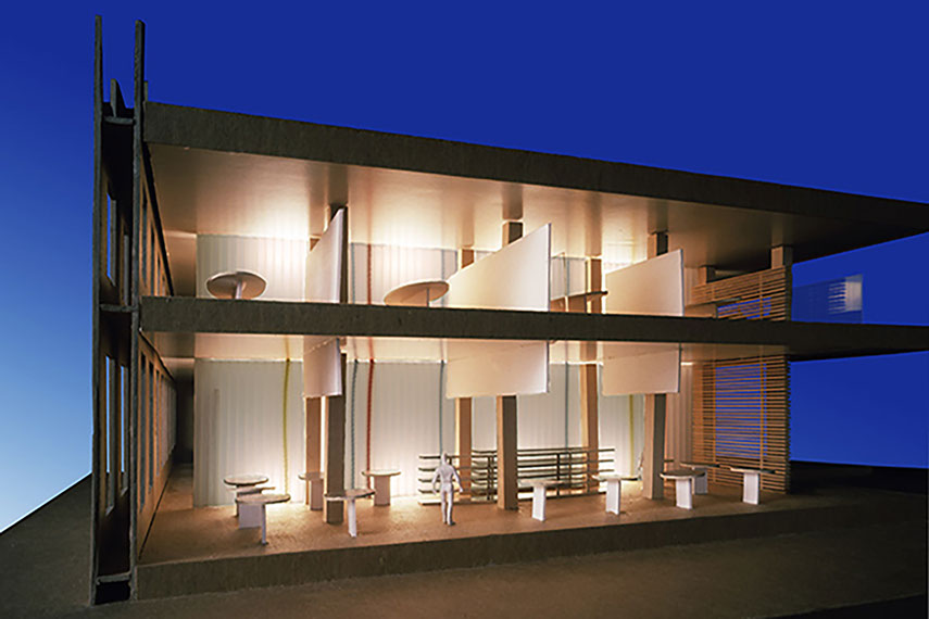The relationship of the new high technology economy and the old economy of timber in the Northwest is the basis for this design. Situated in a historic, heavy timber and brick structure, the conference center serves as a meeting place for Portland’s evolving creative services sector. There are two intersecting planes that slide through the two lower floors: one of fiberglass, colored fiber optic lights, and copper (the wall of technology), and a wood slat wall – a modern interpretation of a traditional timber lodge. The project sets out to set up a high contrast to the historic building with sleek, modern components, and features a composition of floating planes that are used to loosely define space as minimally as possible.