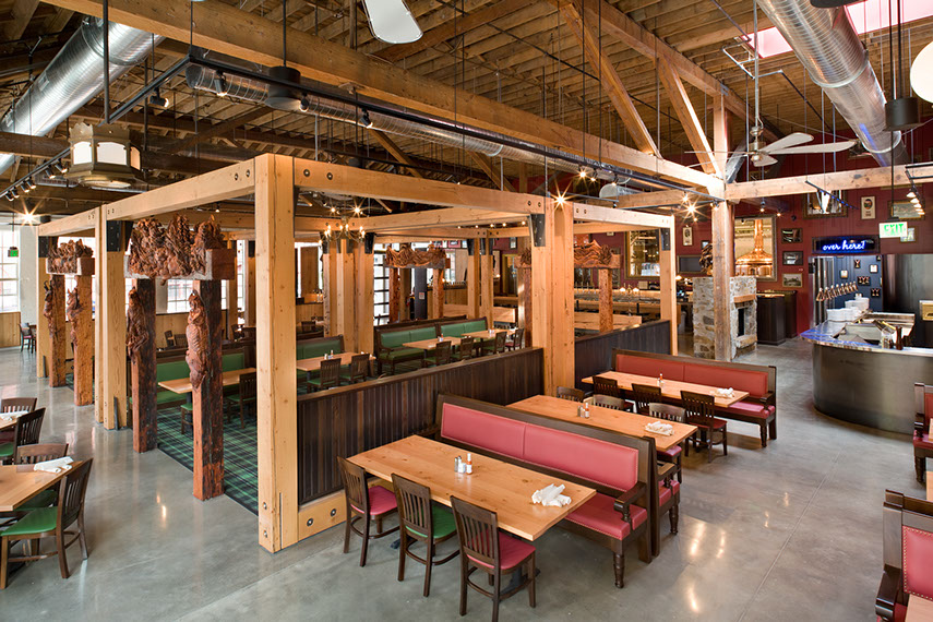 “To tame the big space into an intimate restaurant, bar and brewery, Emmons Architects incorporated a blend of Northwest elements, like exposed timber beams, with dark Scottish colors and walls peppered with whimsical items.”