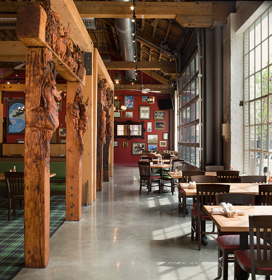 The idea of a Scottish Pub: eclectic, intimate, cozy; combined with the nature of Oregon: old growth timber, fish, wildlife, rustic lodges, everything large scale - came together in a former auto body shop. The Pearl District now has a place that unabashedly says ‘Oregon’.