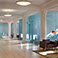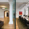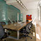 A large room welcomes people. Waiting, meeting, large and small events, and gathering happen here. It also was designed to show art installations from time to time. The space is the new heart of the company, designed to set a tone of respect for history, while embracing contemporary design; an emphasis on gathering and sharing ideas in a collaborative way; and to emphasize the importance of art and culture to the company. The company makes and runs housing, mostly for mid and lower income people. The first view of the space is of a sculpture of 72 small glass houses designed by Sean Healy on a wall behind a large glass reception desk, framed by historic columns, pilasters and coffers. Turning around, the full expanse of the space opens up to view. Rows of oak desks with typewriters used in 1910 are a distant memory, then replaced by endless boxes of rags until a year ago, when the transformation took place. Soot covered, but beautiful plaster columns and coffering, large windows, oak framed interior doors, interior windows with beautiful stained glass confirmed that this space had great potential and almost asked for a new life. It wanted to be reinvented to get back to a proud past as the gleaming headquarters for the Crane Plumbing Company.