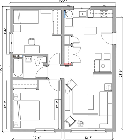 The Kah San Two is modular 835 SF made up of two modules joined in the middle. The two bedrooms apartments are designed for families. The spacious living area has a kitchen on one end and room for a dining table. Bedrooms are well-sized, carpeted and have large windows and closets. A mini split heat pump can be added to maximize energy efficiency.