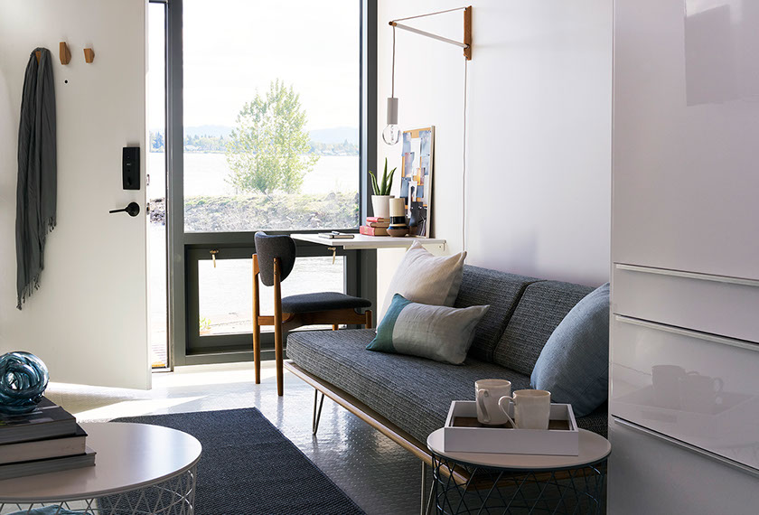 Micro Pod is a 16' x 70' module with 8 living units for people experiencing homelessness. The living units are filled with natural light, and have a casework unit for storage and light food preparation.