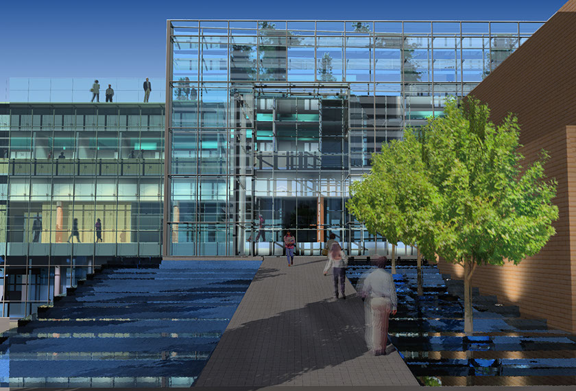Academic wing, and an organically shaped special structure that housed a Patient Simulation Laboratory and Alumni gathering spaces. Between the historic and new structures was a glass enclosed Atrium that had sinewy, intertwined ramps and stairs to encourage people pass-bys, and comraderie. The form of the ramps was a reference to the human circulatory system and muscles.