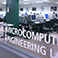 The entry to the project is through a space that has an angled dark blue wall and is planned to have a mural of an enlarged integrated circuit board design. This feature acts as a sign and focus point for the department.