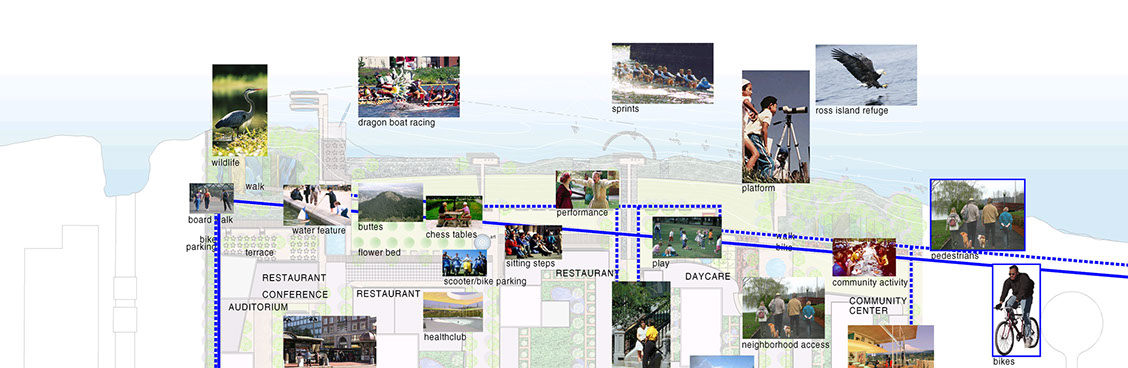 South Park was for everyone! A new city park with beautiful river views and views to the natural habitats of Swan Island nearby. Eagles could be seen flying about. This would become a memorable part of the 40 mile trail, with separate bike and pedestrian trails. The built edge would be public with housing above. Riverfront restaurants lined the park, with one block dedicated to a glassy health club overlooking the park. Eyes on the park for safety, and activity. So for everyone, playgrounds and climbing mounds for kids, a boathouse to finally give Portland a proper rowing center, places to lounge on the grass, overlooks to look at birds and boats, places to sail model boats. Old piers were kept to refer to the sites history. Areas along the river were restored to their original character to give fish and wildlife habitat. This was a park that also started to seep into the streets so the whole South Waterfront district would feel the South Park.