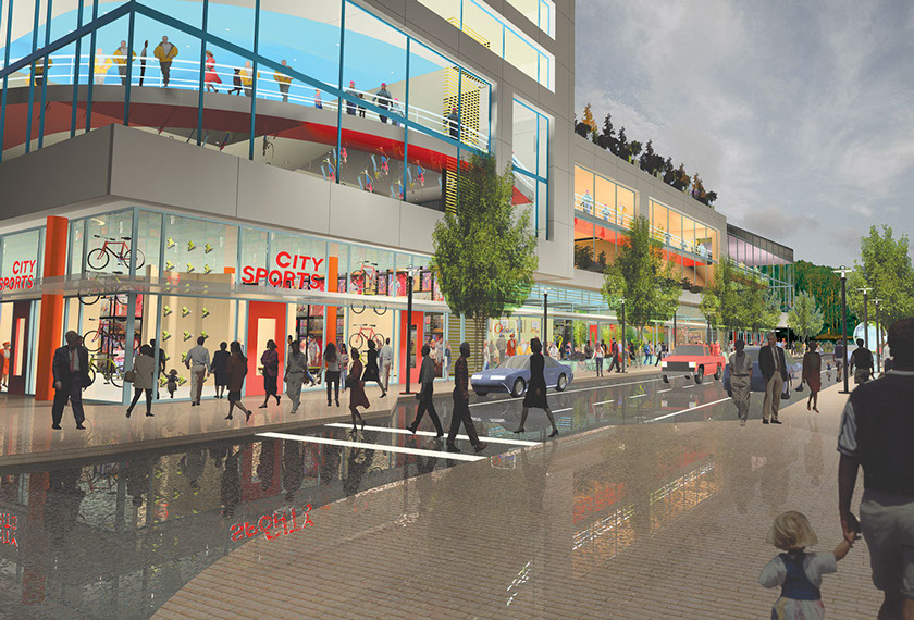 Buildings are designed to maximize human activity on the street, using the ground, second and third floors to make the streets vibrant. Structures are envisioned as parts of the whole — neighboring buildings relate to each other — and contribute to the character of each street. Existing forms and materials from the site are used to add richness.