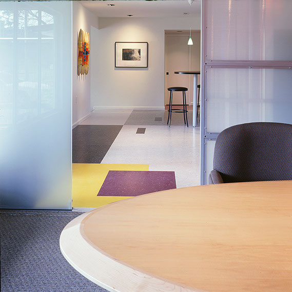 The house was a mess. After years as a shag-carpeted, wood-paneled, dingy ranchburger house, the structure was severely flooded in the winter of 1996. In 1998, the damaged house was given a new life – being transformed into a wide-open, bright and colorful work environment for a small, high technology firm.