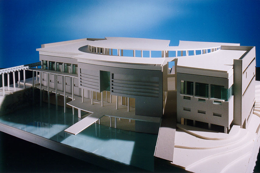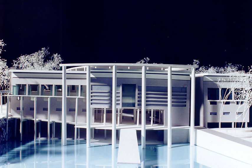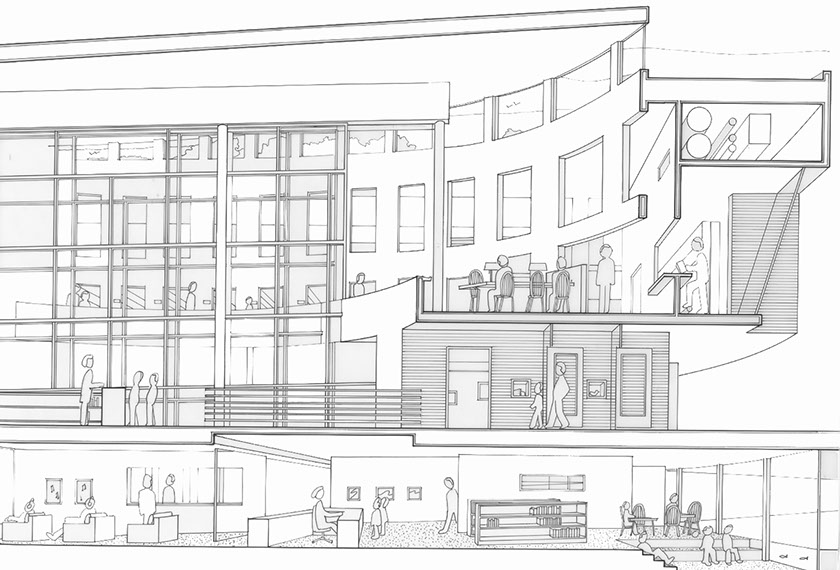 The front entry to the building was over a bridge spanning a reflecting pool. A colonnaded front porch that reflected the area’s close ties to Thomas Jefferson’s designs was at the entry. The front side’s fenestration and proportioning were modern interpretations of traditional Virginia libraries. Instead of shutters, there was more glass, but stepped and sized to reflect traditional wood shutters. The symmetry of the building was impacted by the program and site conditions, such as a ramp from the parking lot and a bicycle path coming through the building along a rail right-of-way.
