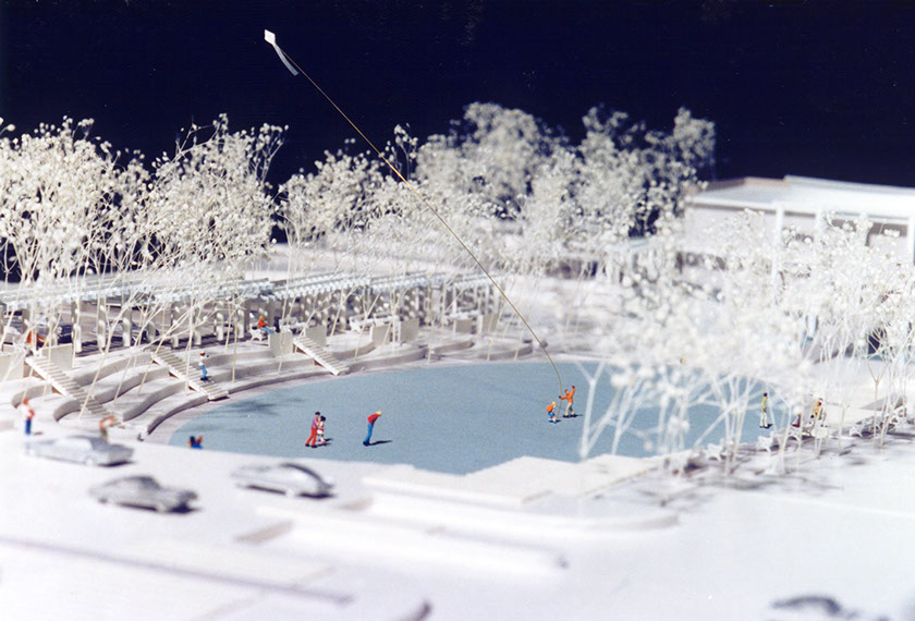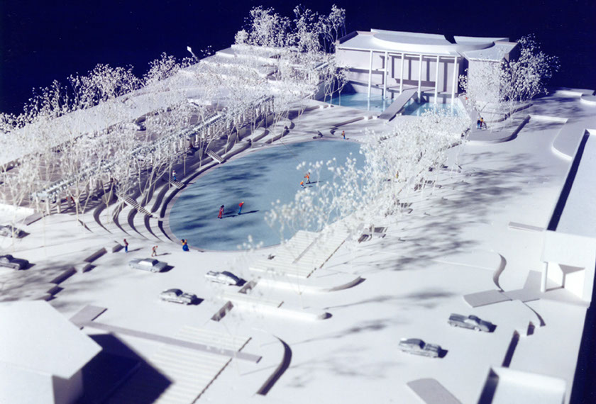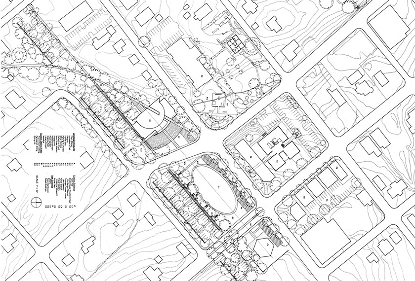 The project emphasized places to gather, from covered sitting areas overlooking the oval to a gently sloping hillside for sitting on the north side. An abandoned rail right-of-way was developed into a bikeway that ran through a gap in the new library building. The parking lot on the east side was fully screened from the oval by a trellised walkway. The trellised walkway was dimensioned to accommodate open air markets that could take place on weekends.