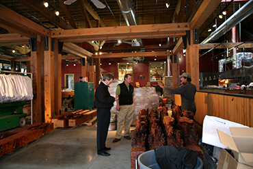is pushed out into the Pub so it is part of the party. The chefs and cooks like working here, and the public likes seeing the action in the kitchen. We designed the Pub so customers walk past the kitchen to get to the restrooms, trophy wall, and to see the Brewery.