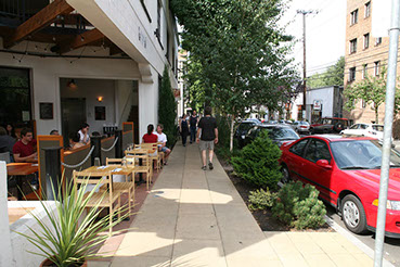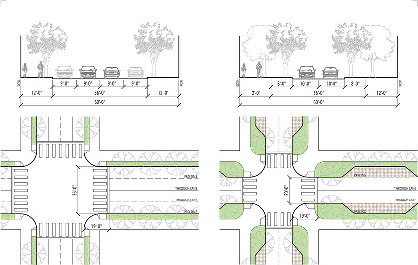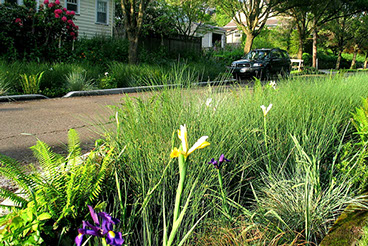 Division Street has great neighborhoods around it, and some good retail, but the street, especially around the ‘Seven Corners’ area, was a wide, inhospitable street with strip mall buildings in some places. The water bureau needed to run a new sewer down the street, and the community and City believed this to be the perfect time to address the quality of Division Street, and make it far more sustainable as well, with a large tree canopy and all public stormwater managed naturally in bioswales rather than a storm sewer. ‘Pro-time’ drive lanes for rush hour traffic promoted by transportation engineers made existing crosswalks long and dangerous, and added to impervious surfaces in the district. After much community pressure, pro-time lanes were eliminated in this area and bioswales and pedestrian friendly crosswalks were added. Bikes were also a consideration, as there was a main bike route from SE Portland going into center city through the Seven Corners area and Ladd’s addition. The new plan was designed to increase bike safety as well.