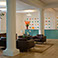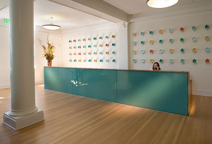 A large room welcomes people. Waiting, meeting, large and small events, and gathering happen here. It also was designed to show art installations from time to time. The space is the new heart of the company, designed to set a tone of respect for history, while embracing contemporary design; an emphasis on gathering and sharing ideas in a collaborative way; and to emphasize the importance of art and culture to the company. The company makes and runs housing, mostly for mid and lower income people. The first view of the space is of a sculpture of 72 small glass houses designed by Sean Healy on a wall behind a large glass reception desk, framed by historic columns, pilasters and coffers. Turning around, the full expanse of the space opens up to view. Rows of oak desks with typewriters used in 1910 are a distant memory, then replaced by endless boxes of rags until a year ago, when the transformation took place. Soot covered, but beautiful plaster columns and coffering, large windows, oak framed interior doors, interior windows with beautiful stained glass confirmed that this space had great potential and almost asked for a new life. It wanted to be reinvented to get back to a proud past as the gleaming headquarters for the Crane Plumbing Company.