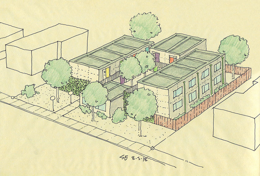 The 265 SF ImHomeToo studios have full baths and kitchenettes and are fully accessible. This project is designed as a prototype for subsequent projects of same and larger scale.