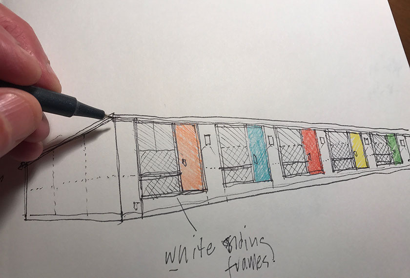 Micro Pod is a 16' x 70' module with 8 living units for people experiencing homelessness. The living units are filled with natural light, and have a casework unit for storage and light food preparation.