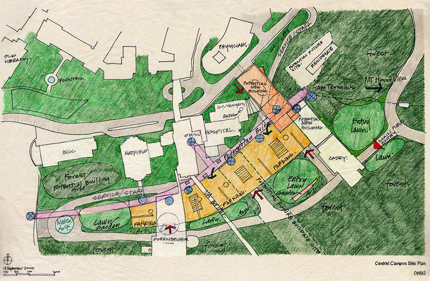 The OHSU Central Campus Master Plan was a plan the ravine area of the campus, and was designed to make the OHSU hospital and patient areas far easier to navigate for patients and visitors. It would also separate the university buildings and campus more from the hospital areas. The plan envisioned an east-west circulation spine of parking and a pedestrian bridge that would connect the existing hospital and new structures. This plan also considered the new South Waterfront campus, and how it connected to the existing OHSU campus on Marquam Hill. The plan was part of the planning for the new ‘Women’s Center Building’ to the east of the existing hospital building. After this plan, OHSU made the decision to incorporate the Women’s Center into a much larger building (now the Kohler Pavilion) that would also have surgery suites and in-patient rooms.