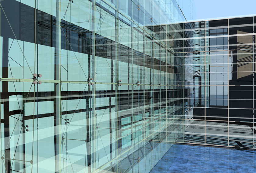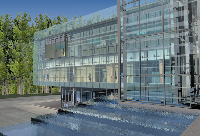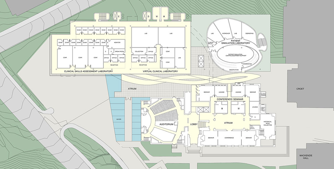 Academic wing, and an organically shaped special structure that housed a Patient Simulation Laboratory and Alumni gathering spaces. Between the historic and new structures was a glass enclosed Atrium that had sinewy, intertwined ramps and stairs to encourage people pass-bys, and comraderie. The form of the ramps was a reference to the human circulatory system and muscles.