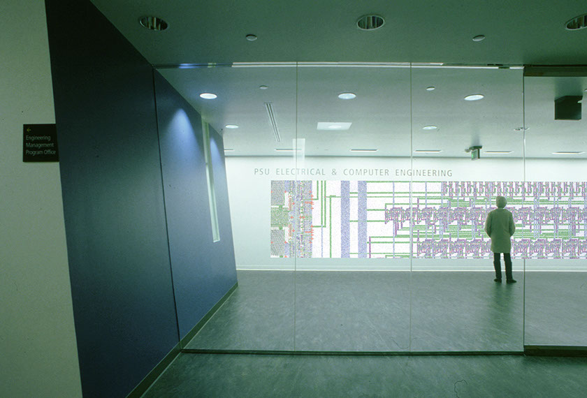 The PSU Electrical and Computer Engineering Department is a 17,000 SF interior remodel project. It is located in a lower level space with very limited access to natural light. A gradually widening corridor was incorporated into the plan to bring light and a view of landscape deep into the project, so as many people as possible can see outside. In addition to minimal natural light, wayfinding was an issue. Brightly colored walls and repeating angled aluminum and glass storefronts at lab entries were utilized to improve the wayfinding throughout the department.