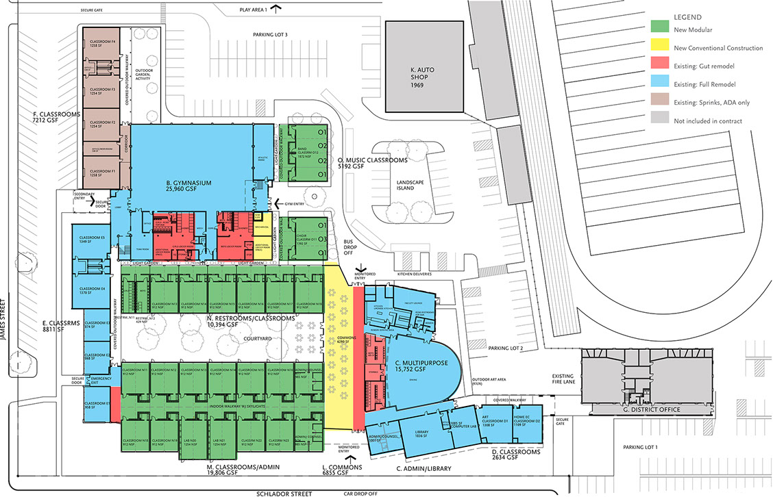 The Silverton School project was a master plan project aimed at upgrading the entire existing high school campus through a combination of existing building remodel and replacement. The goal was to give the Silverton School District a school that was modernized and safe at less cost than full new construction. The entire site was redesigned to improve safety, both for students being dropped off, walking around the campus and for the security of those within the school buildings. The school was designed for 750 students.
