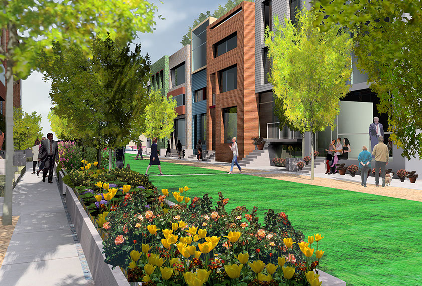 Buildings are designed to maximize human activity on the street, using the ground, second and third floors to make the streets vibrant. Structures are envisioned as parts of the whole — neighboring buildings relate to each other — and contribute to the character of each street. Existing forms and materials from the site are used to add richness.