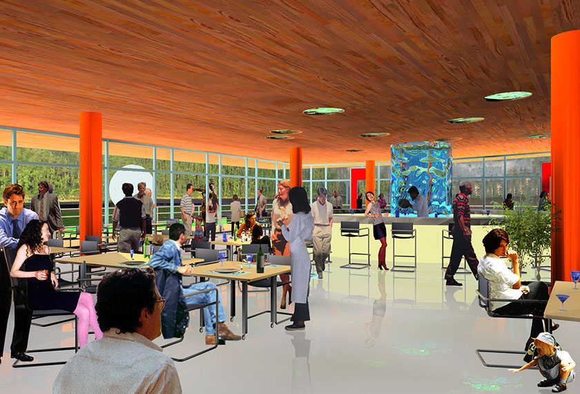 Cafe below the Health Club, overlooking South Park and the River. Ceiling Lights opened views to the Health Club pool above.