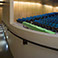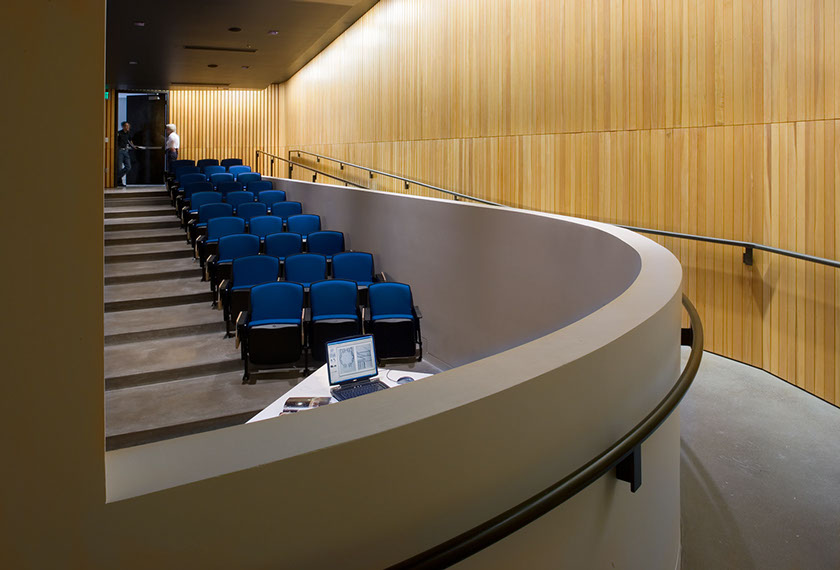 A comfortable room, coupled with an engaging professor, will set the stage for an optimal learning environment. Full flexibility for teaching styles and media are incorporated into the room’s design. Sustainably harvested Douglas fir walls, bathed in warm light, surround room 177’s comfortable blue chairs, while a curving white wall seeks to bring the teaching and learning environments together. The fir slats rhythmically open towards the rear to control acoustics with natural cotton insulation behind.