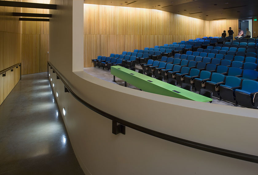 The existing room was cavernous, inaccessible, noisy, cold, uninviting and very uncomfortable. It was Oregon’s leading design school’s primary lecture hall. We significantly decreased the room’s volume as well as making it fully accessible by bringing in six feet of fill to the room and repouring the floor. A ramp curves down one side and around the back of the projection wall to make the room accessible. Entries were redesigned with light and sound breaks from the distracting adjacent lobby, and the acoustics were carefully reworked so everyone could hear the lecturer without amplification. Seats were chosen for comfort and function. At the room’s entry, an unexpected green glass wall startles the passer by. A glimpse of a warm fir wall is caught.